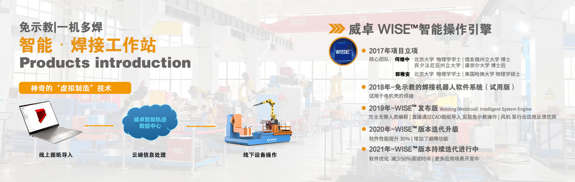 無錫威卓智能機(jī)器人有限公司成立于2017年,是無錫市政府引進(jìn)的科技領(lǐng)軍型高新技術(shù)企業(yè),公司研發(fā)團(tuán)隊80余人,我們堅持自主創(chuàng)新,利用自主開發(fā)的虛擬制造技術(shù)對傳統(tǒng)焊接行業(yè)進(jìn)行升級改造。 公司主推的工業(yè)風(fēng)機(jī)系列-智能焊接工作站產(chǎn)品,具有免示教、實(shí)時跟蹤、簡易工裝、傻瓜式操作等優(yōu)點(diǎn),真正幫助企業(yè)解決了招焊工難,用工成本高,焊接質(zhì)量不穩(wěn)定等問題。